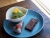 この日のおまかせデザートプレートは大麦若葉の葛プリン、 酒粕をつかった濃厚なチョコテリーヌ、 イチゴとチョコのローケーキの三種。
